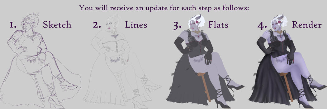 I will send you progress pictures: sketch, then lines, then flat color. I will wait for approval on each before proceeding. Please offer me a way to get into contact with you that you will check regularly or this will delay your commission time, as I will wait for your go-ahead to proceed with each step.PAYMENT